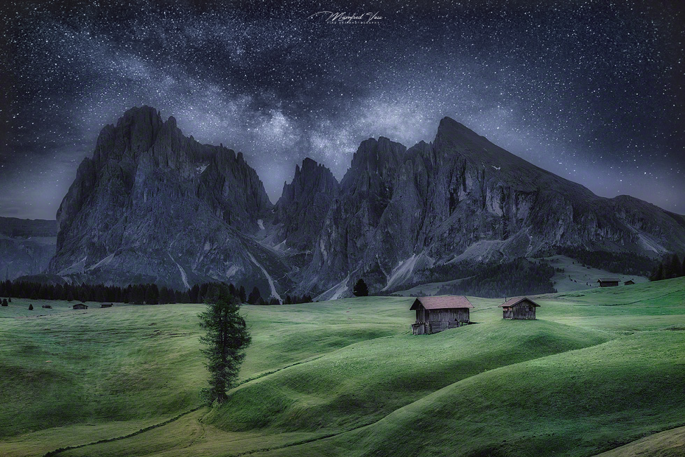 Nachtbild von der Seiser Alm ( Alp de susi ) mit Sternen Hütten Wiesen und Feldern sowie dem Langkofel Berg im Hintergrund.